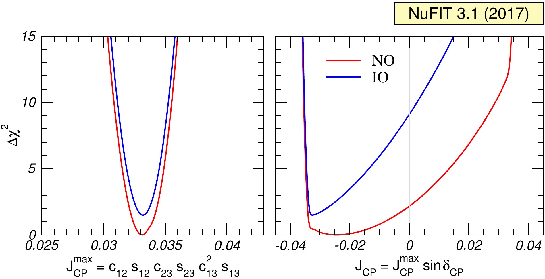 Dependence of Δχ2 on the Jarlskog invariant (right) and its δCP-independent modulus (left). The red (blue) curves are for Normal (Inverted) Ordering. |